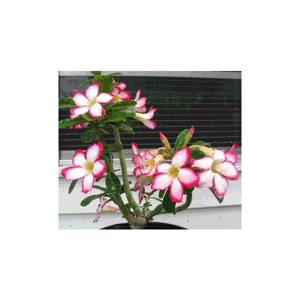 Adenium Noble Concubine est cultivé à Taïwan. Il peut être cultivé comme un arbuste ou un petit arbre. En nature il peut atteindre 1m50 à 2m50 (5 à 8 pieds) et est deux fois moins large que haut. La forme du tronc, le feuillage et les fleurs sont tous très attrayants. La base est large (obesum) et de différentes formes. L'arbre possède de magnifique, longues feuilles vertes et lustrées. Elles tomberont toutes en Hiver. Adenium Noble Concubine fleurit abondamment. Les fleurs sont blanches et possèdent un contour rose vif bien défini. La Rose du Désert développe un tronc massif avec l'âge, mais fleurira très tôt, habituellement lorsqu'il aura atteint 15cm (6") de haut. Taillez seulement après l'Hiver. Évitez les tailles sévères. Les nouvelles pousses peuvent être taillées régulièrement. Lavez-vous les mains après la taille, le latex de son bois exposé est poison. Zones de rusticité 9 -11, (4°C/40°F,-5°C/25°F) en Hivers. De longues périodes sous 40°F (4°C) pourraient tuer le bout de certaines branches. En Été, si possible, placer l'arbre en plein soleil ou à un endroit partiellement ensoleillé. Il a besoin de beaucoup de lumière et d'air frais. Placez au soleil en Hiver. Idéalement, la température ne devrait jamais descendre sous 12°C (54°F). Toutefois, en Hiver, il est préférable de conserver l'arbre entre 12-16°C (54-61°F), donnez à l'arbre la période de repos dont il a besoin. Utilisez un mélange constitué de 2 parties de mousse de sphaigne pour une partie de sable. Il aime un sol légèrement alcalin. Fertilisez au mois, au Printemps et en Été. Arrosez régulièrement lors de la croissance, conservez plutôt sec en Hiver. L'arbre a besoin d'un excellent drainage. Il perdra des feuilles prématurément s'il est trop arrosé.