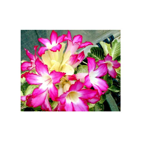 Adenium Noble est cultivé à Taïwan. Il peut être cultivé comme un arbuste ou un petit arbre. En nature il peut atteindre 5 à 8 pieds et est deux fois moins large que haut. La forme du tronc, le feuillage et les fleurs sont tous très attrayants. La base est large (obesum) et de différentes formes. L'arbre possède de magnifique, longues feuilles vertes et lustrées. Elles tomberont toutes en Hiver. Les fleurs roses et blanches se développent à l'année en plein soleil. Le périmètre de la fleur est rouge et l'intérieur est d'un blanc pure. La floraison est abondante. La Rose du Désert développe un tronc massif avec l'âge, mais fleurira très tôt, habituellement lorsqu'il aura atteint 6" de haut. Taillez seulement après l'Hiver. Évitez les tailles sévères. Les nouvelles pousses peuvent être taillées régulièrement. Lavez-vous les mains après la taille, le latex de son bois exposé est poison. Zones de rusticité 9 -11, (4°C/+40°F,-5°C/25°F) en Hivers. De longues périodes sous 40°F (4°C) pourraient tuer le bout de certaines branches. En Été, si possible, placer l'arbre en plein soleil ou à un endroit partiellement ensoleillé. Il a besoin de beaucoup de lumière et d'air frais. Placez au soleil en Hiver. Idéalement, la température ne devrait jamais descendre sous 54°F. Toutefois, en Hiver, il est préférable de conserver l'arbre entre 54-61°F, donnez à l'arbre la période de repos dont il a besoin. Utilisez un mélange constitué de 2 parties de mousse de sphaigne pour une partie de sable. Il aime un sol légèrement alcalin. Fertilisez au mois, au Printemps et en Été. Arrosez régulièrement lors de la croissance, conservez plutôt sec en Hiver. L'arbre a besoin d'un excellent drainage. Il perdra des feuilles prématurément s'il est trop arrosé.