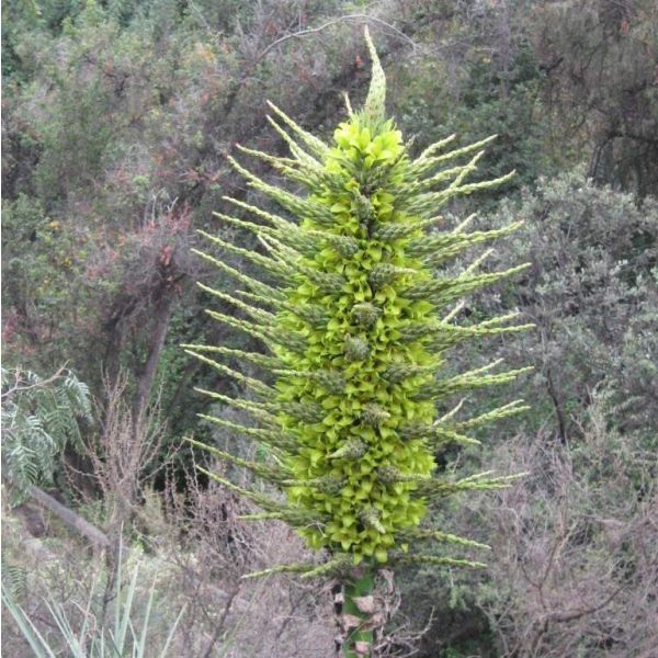 | Germination | Puya chilensis is easy to germinate. Any small containers will do. For the soil use 2 parts high-quality potting soil and 2 parts perlite, and 1 part sand, mixed well. Fill each container to within 1/2" of the top with soil. Water them so they are moist, not wet. Place 1 seed on top, and sprinkle a very thin layer of soil on top - just enough to barely cover the seeds. Spray the top soil with a spray bottle. Put the container in a plastic bag, with some holes in it, to keep moisture. Place the pots in a spot that's about 65-70 degrees, under a fluorescent bulb, or in bright shade. The seeds should sprout within 4-6 weeks, although allow up to 12 weeks for any slow ones. |