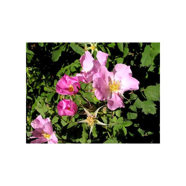 Le Rosa Woodsii, également connu sous le nom de rose des bois ou Pearhip, appartient à la famille des Rosaceae. Cette magnifique espèce est native de l’Amérique du Nord, et on la retrouve au Canada et au États-Unis. C'est un arbuste très gracieux, petit, et rangé qui deviendra environ 3 ou 4 pieds de haut, produisant un bosquet serré avec le temps. Il est un excellent rosier pour un thème de jardin sauvage, car il a une allure très naturelle, et ne deviendra pas trop grand. Ce rosier pourrait être un bon candidat pour un endroit ombragé, puisqu’il semble préférer les endroits ombragés ou semi-ombragés dans son habitat naturel. Le Rosa woodsii est un pluriannuel plus ou moins épineux ou presque sans défenses, avec des piquants habituellement bien développés, droits, minces, infrastipular. Les rosiers sont un mélange de couleurs floues de rouge, marron, jaune, et de vert en automne. Les cannes sont très droites, de couleur grisâtre avec des épines grise plutôt fines. Les feuilles sont alternes, caduques, impair-pinnate avec 5-9 feuillets elliptiques ou ob/ovates, triangulaire vers la base, jusqu'à 5 cm. de long et 2.5 cm. de large, très dentelé. Le feuillage a un aspect mat, et a un lustre bleuâtre. L'aspect global du feuillage est une texture plumeuse délicate. Le feuillage d`automne est souvent très coloré, dans des tons ambres et vermeilles. Le Rosa woodsii a de magnifiques fleurs douces, parfumées et très voyantes. Les fleurs sont petites, environ 2 à 2.5 po de diamètre, d`un rose lilas doux, et individuellement de courte durée. Cette plante produit plusieurs fleurs pendant quelques semaines. Elles apparaissent, dans des inflorescences à tête plate, aux bouts des branches. Les fleurs ont 5 sépales de 1-2 cm. de long et 2-3.5 mm. de large à la base. Les pétales ont 1.5-2.5 cm. de long, rose-clair à rose foncé, avec de nombreuses étamines et beaucoup de pistils. Elles ont un parfum plutôt prononcé. Les fleurs sont hermaphrodites et sont pollinisées par les abeilles. La floraison a lieu de mai à juillet. Les belles fleurs sont remplacées par les fruits rouge foncé (« cynorrhodons »), qui peuvent être farineux ou délicieux, selon la quantité de pluie et d`exposition au soleil de la plante, ainsi que le moment de la récolte. Les fruits sont habituellement meilleurs après plusieurs gels. Les fruits rouges sont de globuleux à ellipsoïde et mesurent 6-12 mm. de long, ce qui ajoute une autre facette à ses mérites. Il y a une couche de poils autour des graines, juste sous la chair du fruit, qui peuvent causer une irritation à la bouche et à la région digestive si ingérées. Zones de rusticité : 4-8 (- 32c/-25f, -10c/15f). Le Rosa woodsii préfère un sol moite, bien drainé et une position ensoleillée. Il se développera également bien dans les sols lourds d'argile, mais ils détestent les sols détrempés. Cette plante peut être trouvée dans les vallées et les flancs de coteau de basses altitudes, au bord des forêts et dans les montagnes. Cela est très excitant de trouver un seul de ces rosiers, couverts de fleurs roses, à dix pieds du sentier du sous-bois d'une forêt de tronc blanc d'Aspen. Le Rosier des bois forme aussi des bosquets dans des terrains découverts, particulièrement le long des drains.