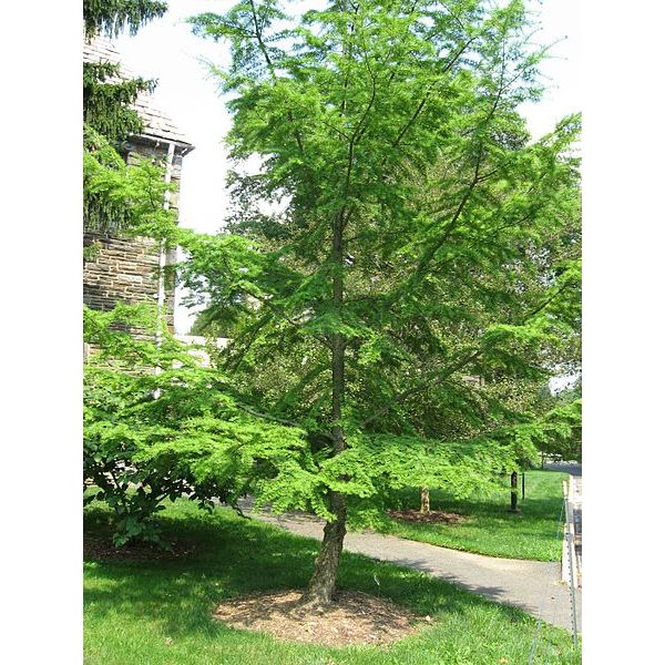 Germination It is a deciduous coniferous tree reaching 30?40 m (98?131 ft) tall, with a broad conic crown. The shoots are dimorphic, with long shoots and short shoots similar to a larch, though the short shoots are not so markedly short, lengthening about 5 mm annually. The leaves are bright green, 3?6 cm long and 2?3 mm broad, with two glaucous stomatal bands on the underside; they turn a brilliant golden yellow before falling in the autumn, hence the common name. The leaves are arranged spirally, widely spaced on long shoots, and in a dense whorl on the short shoots.
