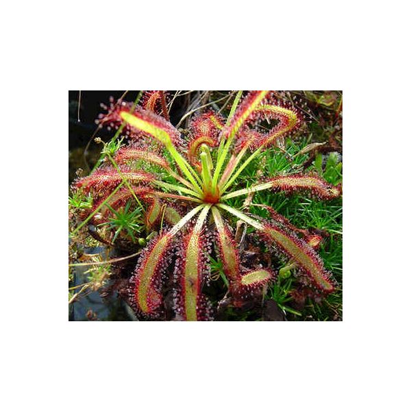 Drosera capensis aux larges feuilles est facile à cultiver. Elle est native de la région du Cape de l'Afrique du Sud. Cette forme se distingue par une trappe beaucoup plus large qui est tombante sous son poids. Très jolie et magnifique au soleil. Les feuilles sont recouvertes de poils qui sécrètent une substance collante qui attire les insectes. Les poils recouvrant la partie supérieure des feuilles leur procurant une apparence d'humidité, irrésistible pour les insectes. Lorsque l'insecte est collé à la feuille, la feuille s'enroule sur lui. Cette Drosera sécrète un enzyme lorsqu'un insecte est détecté et cela jusqu'à ce que l'insecte soit soluble pour la digestion. C'est l'une des Drosera les plus facile à cultiver. Les tentacules sont colorées de rouge si la plante est en plein soleil; magnifique. La plante fleurit à l'Automne à partir de tiges possédant chacune de 6 à 20 petites fleurs roses de 1 cm de diamètre. Les fleurs se reproduisent d'elles-mêmes, et quand le contenant de semences sèche, il relâche des centaines de semences fraîches. Zones de rusticité 8-10, (1°C/35°F, -10°C/15°F) en Hiver. La plante doit être cultivée en plein soleil, avec une protection du chaud soleil de midi. Dans les régions ombragées, une source de lumière artificielle est préférable. Des pousses pâles indiquent que plus de lumière est requis. Une plante en santé aura du rouge sur les tentacules. La température doit être conservée entre (20°C/25°C, 68°F/76°F). La plante n'a pas de période de dormance. Elle peut bien germer dans un mélange de mousse de sphaigne et de sable, qui peut être constitué de 50% à 70% de mousse de sphaigne. Vous n'avez pas à fertiliser puisque la plante compte sur les insectes pour se nourrir. L'humidité doit être entre 60-80%. Elle a besoin d'une atmosphère et d'un sol humide. L'eau doit être distillée ou de l'eau de pluie, puisqu'elles ne tolèrent pas l'eau du robinet. C'est une bonne idée de placer une soucoupe contenant un pouce d'eau, sous le pot. Élevez le pot en plaçant des cailloux, de sorte à ce que la base du pot soit à peine en contact avec l'eau. Ceci procurera à la plante une source d'humidité constante. Pendant l'Hiver, le sol doit être par période sec et par période humide.