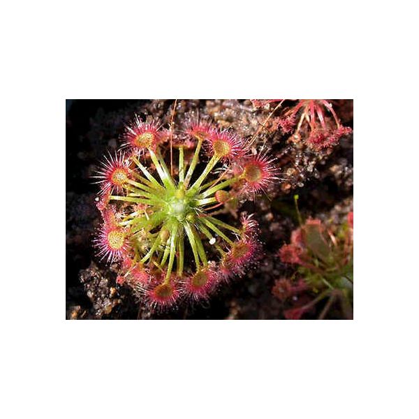 La Drosera pygmaea est probablement la plus connue des Pygmées. C'est une espèce retrouvée au Sud-ouest de l'Australie et de la Nouvelle-Zélande. Le climat est celui de la Méditerranée, avec de chauds et secs Étés et des Hivers froids et humides. Chaque feuille est constituée d'une mince pétiole et d'une tentacule ronde, rouge, de 2 mm de diamètre. Les feuilles sont disposées en rosette, s'étendant de 1.5 à 2 cm en largeur. La floraison se produit au début du Printemps, jusqu'à la mi-Été. On retrouve une fleur blanche par tige et il peut y avoir plusieurs tiges par plant. La surface des feuilles est recouverte de tentacules collantes. Les insectes sont attirés aux feuilles par la luisance des poils et par le nectar. Une fois attrapé, l'insecte est digéré par les fluides digestifs émis par la plante. C'est une façon unique d'obtenir du nitrogène, permettant à ces plantes de vivre dans des sols pauvres en cette substance. Les feuilles s'enroulent autour des proies tel le mouvement d'un poignet. Certains pourraient être découragés par leur taille, mais leur beauté réside en leur nombre. Parce que la plante se reproduit à partir de gemmes, elles couvrent rapidement une grande surface, formant un véritable tapis. Les Drosera Pygmées diffèrent des autres Drosera par leur capacité de former des gemmes. Pendant les mois d'Hiver, les Pygmées produisent des gemmes plutôt que des feuilles. Ceux-ci sont des corps ronds se formant au centre de la plante. C'est en fait des semences qui n'ont pas besoin d'être fertilisées. Le pourcentage de germination est beaucoup plus élevé que celui des semences. Les plants se développent également plus rapidement et deviennent matures dès le Printemps suivant. Puisque ces plantes produisent beaucoup de gemmes, elles se propagent facilement et rapidement. Lorsque la plante forme des gemmes, retirez-les à l'aide d'un pinceau et assurez-vous de les recueillir. Même si vous ne voulez pas de nouveaux plants, il est préférable de le faire, question de bien entretenir la plante et éviter les maladies. Zones de rusticité 8-10, (1°C/35°F, -10°C/15°F) en Hiver. La plante requiert des Étés chauds et secs et des Hivers froids et humides. Elle doit être cultivée en plein soleil, avec une protection du chaud soleil de midi. Dans les régions ombragées, une source de lumière artificielle est essentielle. La température doit être conservée entre 20°C/68°F et 25°C / 80°F. Cette Drosera Pygmée a de très longues racines et pousse mieux dans un pot profond, de 15 à 20 cm. Elles peuvent bien germer dans un mélange de mousse de sphaigne et de sable, qui peut être constitué de 30% à 100% de mousse de sphaigne. Vous n'avez pas à fertiliser puisque la plante compte sur les insectes pour se nourrir. L'humidité doit être entre 60-80%. Le sol doit être constamment humide en Hiver; ne laissez pas le sol s'assécher entre les arrosages. Pendant l'Été le plant devient dormant et devrait recevoir suffisamment d'eau pour conserver seulement la partie inférieure du pot humide, le dessus doit être plutôt sec. L'eau doit être distillée ou de l'eau de pluie, puisqu'elle ne tolère pas l'eau du robinet.