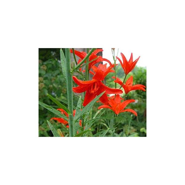 En Juin et Juillet, ce Lys développe des fleurs bien droites, 10 ou plus par plant, de 5 à 7 cm (2 à 3") de diamètre et d'un rouge vermillon.