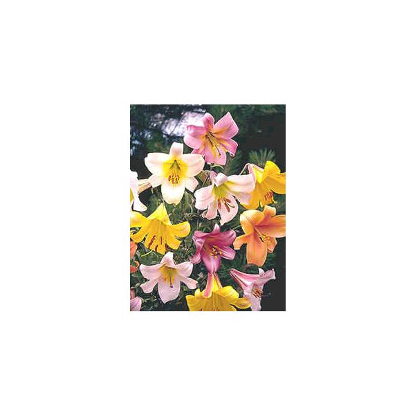 Ceci est un mélange de Trompettes et Aurélianes hybrides. Ces plantes vivaces peuvent atteindre de 4 à 6 pieds de haut. Les Trompettes et Aurélianes sont des fleurs très fragrantes. Pour certains, aucun Lis n'est vraiment un Lis si ce n'est une Trompette. Les Lis Trompettes n'ont pas leur pareil dans un jardin, grands, magnifiques, avec de larges fleurs cirées émanant une forte fragrance. Les fleurs peuvent prendre plusieurs couleurs, un pure blanc, doré, jaune, rose, prune et autres. Les plantes fleurissent de la mi-saison à tard en saison. Les fleurs sont hermaphrodites, elles ont chacune les organes mâles et femelles. Le feuillage meurt en Hiver. Ce groupe de Lis produira les plus gros bulbes de la famille des Lis. Les bulbes ne sont jamais complètement dormant, ils doivent être manipulés délicatement. Zones de rusticité 5-9, (-26°C/-15°F, -5°C/25°F) en Hiver. Les bulbes se développent bien dans des régions où l'Hiver n'y est pas trop sévère, environ 30°F. Si vous les cultivez dans un climat plus rigoureux, protégez-les en Hiver. Un peu de froid ne causera pas de dommage. Procurez un sol riche, bien drainé, avec un pH acide à neutre. Arrosez régulièrement; ne pas trop arroser à chaque fois et ne laissez pas le sol s'assécher complètement. Ils peuvent croître au soleil ou partiellement à l'ombre.