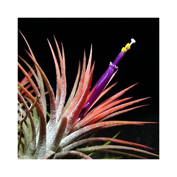 Tillandsia ionantha appartient à la famille des Bromeliaceae. Natif de l’Amérique Centrale on le trouve du Mexique jusqu’au Nicaragua. Cet épiphyte est bien adapté à sa place écologique plutôt unique, poussant attachée aux branches élevées des arbres. Tillandsia ionantha forme une rosette touffue, à port d’aloès, de 8 à 10 cm de haut. Ses feuilles sont colorées du gris au rouge. Elles sont triangulaires, coriaces, superposées et surtout érigées. La face inférieure est écailleuse et grisâtre. Avant la floraison, le bout des feuilles (bractées) centrales vire au rose. Lors de la floraison, les fleurs violettes terminales, aux longues étamines comme deux baïonnettes de couleur jaunes, apparaissent au cœur de la plante. La culture du tillandsia est assez facile si l'humidité est élevée. La plante dépérit lentement et meurt quelques années après sa floraison. Les rejets qui apparaissent à la base fleuriront à leur tour quelques années plus tard. Récupérez les rejets lorsque la plante mère est desséchée et placez-les dans de petits pots. Zones de rusticité: 9-11 (-5°C/25°F, 4°C/40°F) en hiver. Le tillandsia exige une lumière vive en été et du soleil en hiver. Placez-le de préférence près d'une fenêtre orientée à l'ouest en été et au sud en hiver. La température idéale en été est de 22 à 24 ºC. En hiver la température peut être plus fraîche (18 à 16 ºC) mais elle ne doit pas descendre en dessous de 13 ºC. Gardez le taux d'humidité de l'air élevé. Si vous n'avez pas d'humidificateur, vaporisez la plante régulièrement avec de l'eau à température de la pièce. Si vous la cultivez en pot, posez-la sur un lit de gravier humide. Éliminez les feuilles jaunies, coupez l'inflorescence après la floraison et vaporisez régulièrement le feuillage. Cette plante absorbe l'eau principalement par ses feuilles. Vaporisez régulièrement la plante avec de l'eau à température ambiante. Vous pouvez plonger la plante avec son support dans de l'eau à température ambiante (additionnée d'une faible dose d'engrais) pendant une heure, puis laissez égoutter. Si la plante est cultivée en pot, arrosez modérément pour humidifier le substrat et enlevez les surplus d'eau. Laissez sécher le substrat légèrement entre les arrosages, jamais complètement. En hiver, si les températures sont plus fraîches, réduisez les arrosages et les vaporisations en laissant bien sécher la surface du substrat. Le tillandsia tolère mal les excès de sels minéraux. Pendant la période de croissance, fertilisez une fois par mois en vaporisant sur le feuillage une solution contenant du 20-20-20 dilué de moitié. Le tillandsia développe peu de racines. C'est pourquoi il est souvent fixé sur des morceaux de bois ou des plaques d'écorce à l'aide de fil de fer, les racines entourées de mousse de sphaigne. Son installation peut avoir lieu toute l'année, sauf pendant la floraison. Le tillandsia peut aussi être cultivé en pot si le substrat est poreux et se draine bien. Dans ce cas, vous pouvez utiliser des fibres d'osmonde, de la mousse de sphaigne ou de la tourbe de sphaigne et de la perlite comme substrat et du gravier pour le fond du pot. Cette plante une fois en pot ne doit presque jamais être rempotée.