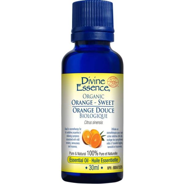 Orange Douce Biologique (Citrus Sinensis) - Huile Essentielle 100% pure et non diluée DIVINE ESSENCE ® HUILES ESSENTIELLES AUTHENTIQUES DE QUALITÉ SUPÉRIEURE, COMPLÈTES, CHÉMOTYPÉES, À PRIX ABORDABLES ! Certifiée biologique par ECOCERT Canada.