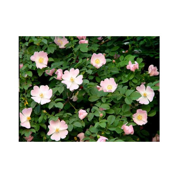 Rosa canina, églantier commun ou Nesri est de la famille des rosacées. Natif de l`Europe, du nord-ouest de l`Afrique et de d`Asie. Le Rosa Canina est un arbrisseau épineux pouvant atteindre trois mètres de haut. Les rosiers peuvent être autoportants ou grimpeurs ; les spécimens les plus grands emploient invariablement d'autres plantes pour appui. Ils font de superbes taches de couleur dans les bordures de haies pendant juin et juillet. Ses longues branches dressées sont arquées et épineuses sauf sur les branches florales dépourvues d'épines. Les feuilles alternes, composées, comprennent 5 à 7 folioles elliptiques dentées. Les fleurs, ou églantines, de 4 à 5 cm de diamètre, ont une corolle simple à cinq pétales blanc rosé, et de nombreuses étamines. Elles sont souvent solitaires ou réunies en corymbes et situées à l`extrémité des rameaux. Le réceptacle floral est creusé en forme d'urne (hypanthium) qui contient les carpelles velus. Les fruits de forme ellipsoïde, sont rouges à maturité, vers le mois d'octobre. Ils ont de 1,5 à 2 cm de long. Ils sont en fait issus de la transformation du réceptacle floral, qui contient les vrais fruits. Le fruit appelé "cynorrhodon" se compose d'akènes très durs et velus qui ne sont autres que le fameux « poil à gratter ». Ces akènes sont enfermés dans une sorte de bourse charnue qui se teinte en rouge vif quand elle est à maturité. Zones de rusticité : 4-9 (-32°C/-25°F, -5°C/25°F) en hiver. Robuste jusqu'à -15°C ou à plus. Il prospère dans un éventail de sols, excepté les sols très secs ou inondés. Une fois établit, arrosez les suffisamment et placer les au soleil ; un bon drainage est essentiel, bien que des sols plus lourds soient également toléré.