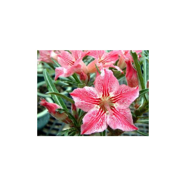 Adenium Danse du Papillon est cultivé à Taïwan. C'est une variété récente. Il peut être cultivé tel un arbuste ou un petit arbre. En nature il peut atteindre 5 à 8 pieds et est deux fois moins large que haut. La forme du tronc, le feuillage et les fleurs sont tous très attrayants. La base est large (obesum) et de différentes formes. L'arbre possède de magnifique, longues feuilles vertes et lustrées. Elles tomberont toutes en Hiver. Deux à trois teintes de rose compose la couleur de la fleur. La fleur fleurit très facilement et fait de 3-4 cm de diamètre. La Rose du Désert développe un tronc massif avec l'âge, mais fleurira très tôt, habituellement lorsqu'il aura atteint 6" de haut. Taillez seulement après l'Hiver. Évitez les tailles sévères. Les nouvelles pousses peuvent être taillées régulièrement. Lavez-vous les mains après la taille, le latex de son bois exposé est poison. Zones de rusticité 9 -11, (4°C/+40°F,-5°C/25°F) en Hivers. De longues périodes sous 40°F (4°C) pourraient tuer le bout de certaines branches. En Été, si possible, placer l'arbre en plein soleil ou à un endroit partiellement ensoleillé. Il a besoin de beaucoup de lumière et d'air frais. Placez au soleil en Hiver. Idéalement, la température ne devrait jamais descendre sous 54°F. Toutefois, en Hiver, il est préférable de conserver l'arbre entre 54-61°F, donnez à l'arbre la période de repos dont il a besoin. Utilisez un mélange constitué de 2 parties de mousse de sphaigne pour une partie de sable. Il aime un sol légèrement alcalin. Fertilisez au mois, au Printemps et en Été. Arrosez régulièrement lors de la croissance, conservez plutôt sec en Hiver. L'arbre a besoin d'un excellent drainage. Il perdra des feuilles prématurément s'il est trop arrosé.