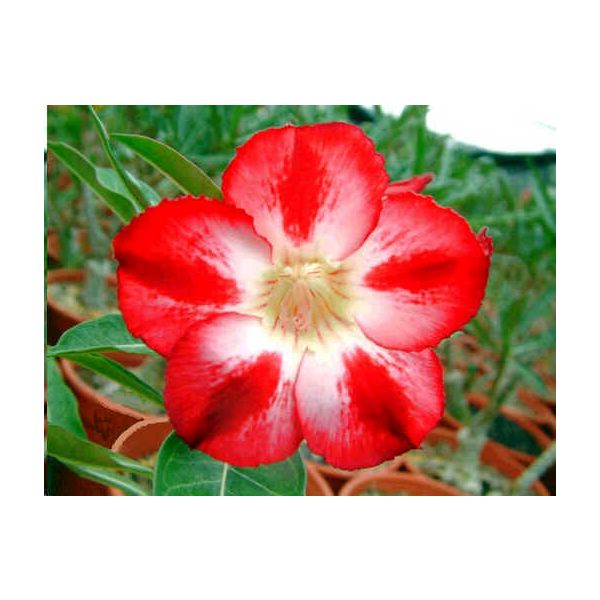 Adenium Étoile de Demain est cultivé à Taïwan. Il peut être cultivé tel un arbuste ou un petit arbre. En nature il peut atteindre 1.5 à 2.40 m et est deux fois moins large que haut. La forme du tronc, le feuillage et les fleurs sont tous très attrayants. La base est large (obesum) et de différentes formes. L'arbre possède de magnifique et longues feuilles vertes, lustrées. Elles tomberont toutes en Hiver. C'est une grosse fleur rouge et pleine, ayant des marques rouge foncé prenant la forme d'une étoile. La floraison est importante. Cette variété devrait devenir très populaire. La fleur atteint 6-9 cm. La Rose du Désert développe un tronc massif avec l'âge, mais fleurira très tôt, habituellement lorsqu'il aura atteint 6" de haut. Taillez seulement après l'Hiver. Évitez les tailles sévères. Les nouvelles pousses peuvent être taillées régulièrement. Lavez-vous les mains après la taille, le latex de son bois exposé est poison. Zones de rusticité 9 -11, (4°C/40°F,-5°C/25°F) en Hivers. De longues périodes sous 40°F (4°C) pourraient tuer le bout de certaines branches. En Été, si possible, placer l'arbre en plein soleil ou à un endroit partiellement ensoleillé. Il a besoin de beaucoup de lumière et d'air frais. Placez au soleil en Hiver. Idéalement, la température ne devrait jamais descendre sous 54°F. Toutefois, en Hiver, il est préférable de conserver l'arbre entre 54-61°F, donnez à l'arbre la période de repos dont il a besoin. Utilisez un mélange constitué de 2 parties de mousse de sphaigne pour une partie de sable. Il aime un sol légèrement alcalin. Fertilisez au mois, au Printemps et en Été. Arrosez régulièrement lors de la croissance, conservez plutôt sec en Hiver. L'arbre a besoin d'un excellent drainage. Il perdra des feuilles prématurément s'il est trop arrosé.